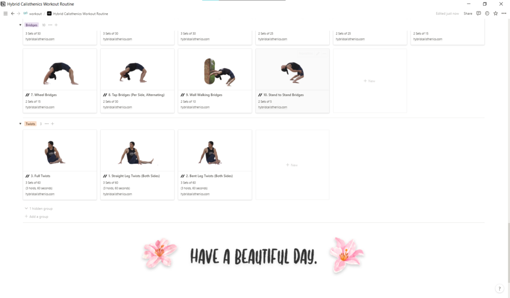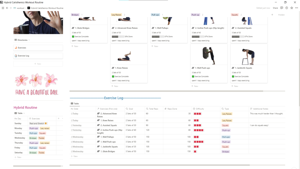 A Notion template that tracks your progress in Hybrid Calisthenics Exercise Routine from Hampton's website.
